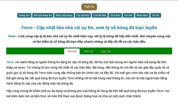 7mvn là một trong những trang web cung cấp thông tin về bóng đá uy tín và chất lượng. Website thiết kế đầy đủ tất cả những tính năng hữu ích để hỗ trợ người dùng. Thông tin hiển thị trên trang web không chỉ cung cấp về tỷ lệ kèo, lịch thi đấu, bảng xếp hạng mà còn nhận định và soi kèo.