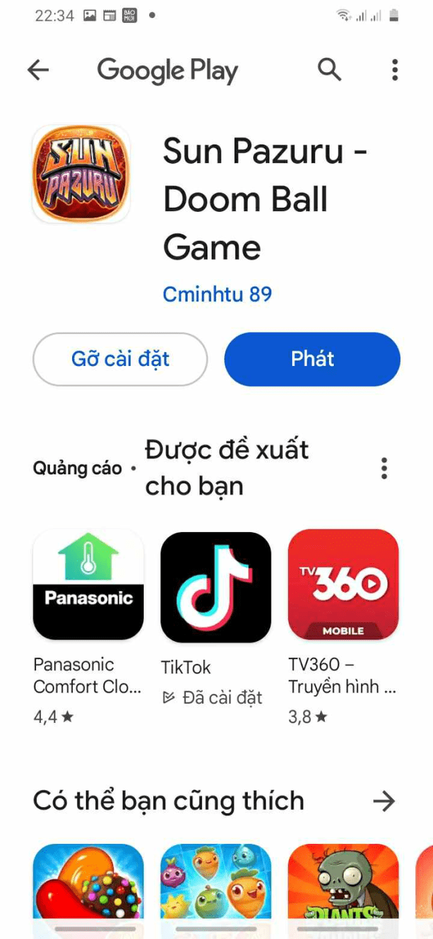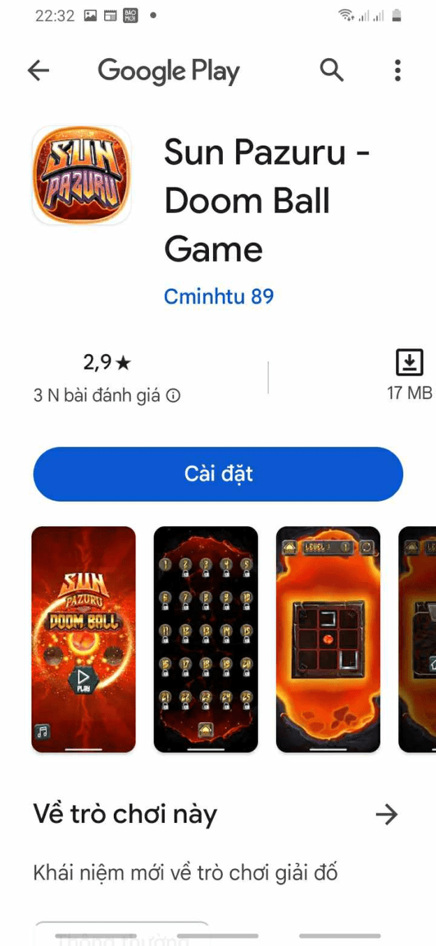 Bước 3: Tiếp theo, hệ thống sẽ chuyển hướng bạn sang giao diện CH Play, tại đây bạn sẽ thấy ứng dụng Sunwin hiển thị với tên “Sun Pazuru – Doom Ball game”, bạn bấm chọn Cài đặt để tải Sunwin về điện thoại.
