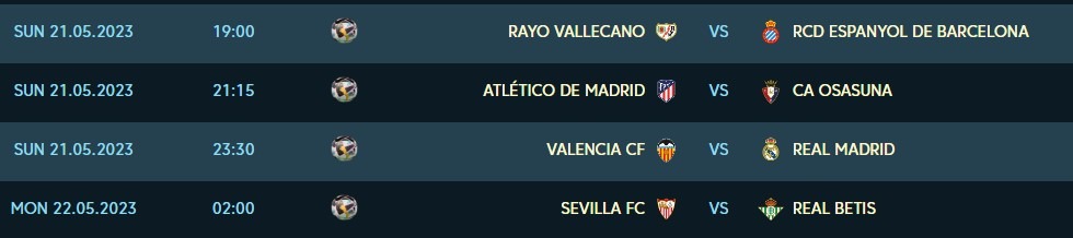 Barcelona đã lên ngôi vô địch nhưng không đồng nghĩa La Liga sẽ kém hấp dẫn đi bởi các đội từ vị trí thứ 12 tới 7 vẫn còn đang cạnh tranh nhau rất gắt gao cho một tấm vé tham dự Conference League mùa sau khi họ chỉ hơn kém nhau từ 1 đến 4 điểm.