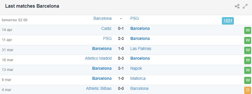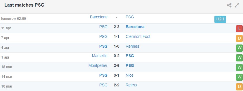 Phong độ gần đây của Barcelona vs PSG