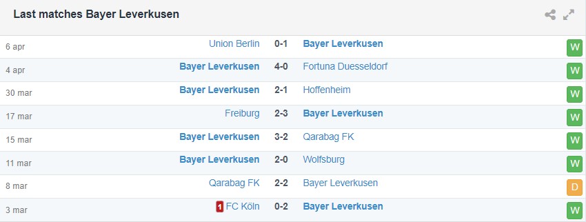 Hành trang của Leverkusen trước thềm trận đấu này là 25 trận sân nhà gần nhất không thua, trong đó có chuỗi 7 trận thắng sân nhà liên tiếp. Tính rộng ra, thầy trò Alonso đã bất bại trong 43 trận vừa qua.