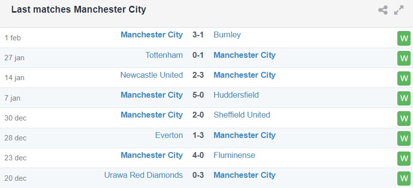 Ở phần sân đối diện, kể từ trận hòa với Crystal Palace vào ngày 16/12 năm ngoái, Man City đã thắng 4 vòng gần nhất tại EPL. Thành tích này giúp The Citizens tiếp tục bám đuổi Liverpool trong cuộc đua vô địch với 5 điểm ít hơn nhưng đá ít hơn 1 trận. Tính rộng ra, đoàn quân của Pep đã bất bại 11 trận vừa qua trên mọi đấu trường.