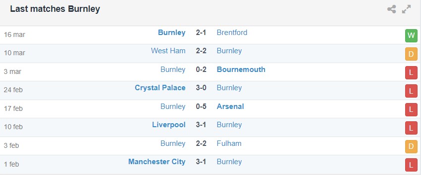 Ở phần sân đối diện, Burnley sau 10 vòng đấu liên tiếp không biết mùi chiến thắng cuối cùng cũng đã giành trọn vẹn được 3 điểm khi đánh bại Brentford 2-1 trên sân nhà ở vòng 29. Dù vậy, thắng lợi này cũng không thể giúp The Clarets thoát khỏi khu vực cầm đèn đỏ khi vẫn còn cách nhóm an toàn tới 5 điểm. Vì thế, họ chắc chắn rất quyết tâm giành một kết quả có lợi ở trận hành quân đến London vào chủ nhật tới nhằm có thể tự cứu mình trong cuộc đua trụ hạng.