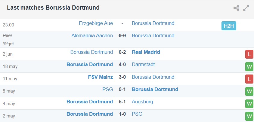 Trong khi Dortmund mới đá trận giao hữu đầu tiên, Erzgebirge Aue đã trải qua 3 trận đấu tiền mùa giải từ ngày 6 tháng 7 với thành tích 2 thắng và 1 thua.