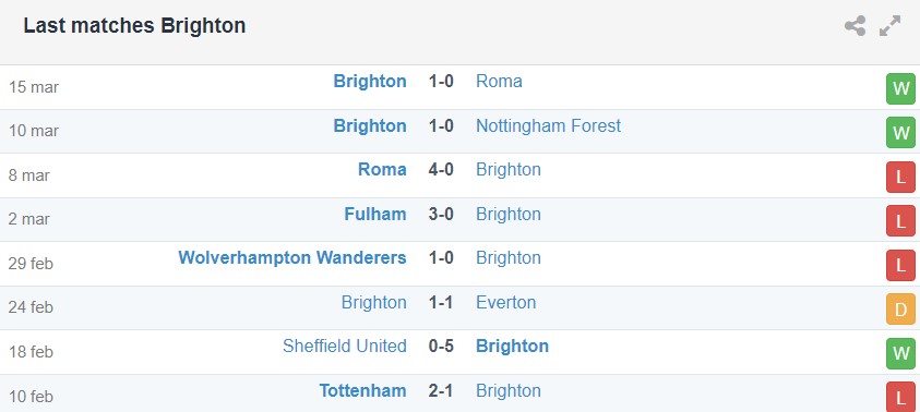 Ở phần sân đối diện, Brighton sau 4 trận liên tiếp không biết mùi chiến thắng giai đoạn cuối tháng 2 đầu tháng 3 đã quay trở lại với 2 trận thắng gần nhất. Dù vậy, thắng lợi 1-0 trước Roma trong số này không giúp họ đi tiếp tại Europa League khi đã để thua tới 4 bàn không gỡ trên đất Ý ở trận lượt đi vòng 16 đội.