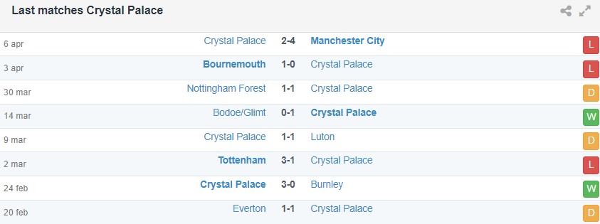 Buồn là vậy, song Liverpool cần nhanh chóng trở lại bởi ít nhất họ vẫn còn cơ hội cạnh tranh cho danh hiệu cao nhất nước Anh khi chỉ thua đội đầu bảng Arsenal hiệu số phụ. Và may thay Palace có thể được xem là con mồi dễ để đoàn quân của Jurgen Klopp tìm lại niềm vui chiến thắng bởi thầy trò Oliver Glasner đang có phong độ khá tệ đã không thắng trong 5 trận đấu gần nhất với 3 thất bại và 2 trận hòa.