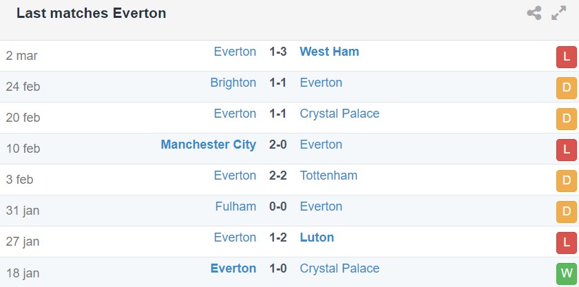 Cụ thể, thầy trò Sean Dyche đã không thắng trong 7 trận nhất trên mọi đấu trường. Tính riêng trên sân khách thì họ cũng không biết mùi chiến thắng 6 trận vừa qua. The Toffees cũng tỏ ra vô duyên tại Old Trafford khi trong 33 lần hành quân đến đây, họ chỉ mới thắng được 1 trận với tỷ số tối thiểu 1-0 vào năm 2013.