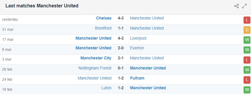 Thất bại mới nhất của đội bóng này tương đối căng đắng khi họ để Chelsea ngược dòng 4-3 thành công chỉ trong 2 phút ở thời gian bù giờ trận đấu. Tuột mất 3 điểm đầy đáng tiếc, Man United xem như đã hết cơ hội giành tấm vé dự Champions League mùa sau khi khoảng cách với top 4 lúc này đã lên tới 11 trận dù họ vẫn còn 1 trận chưa đấu.