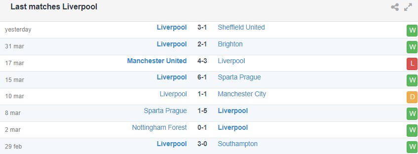 Ở phần sân đối diện, Liverpool lại trái ngược hoàn toàn khi sau thất bại trước chính Man United hồi giữa tháng 3, họ ngay lập tức lấy lại phong độ của mình với 2 trận thắng liên tiếp. 6 điểm tối đa giành được giúp Lữ đoàn đỏ giữ vững ngôi đầu với khoảng cách nhiều hơn 2 đối thủ xếp sau là Arsenal và Man City lần lượt 2 và 3 điểm.