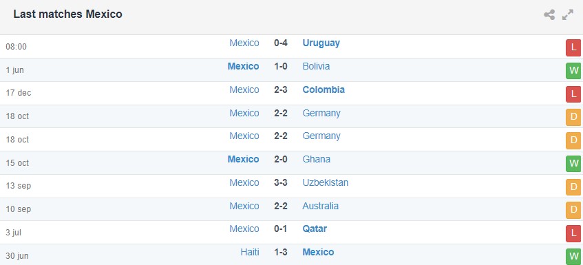 Là 1 trong những đội tuyển Nam Mỹ tập trung sớm nhất, Mexico đã nhanh chóng làm nóng bằng 2 trận giao hữu. Song, kết quả mang lại khó có thể làm hài lòng những CĐV nước này khi họ không những chỉ thắng tối thiểu 1 bàn trước đối thủ yếu hơn là Bolivia, mà còn thảm sát dưới tay Uruguay với tỷ số 4-0.