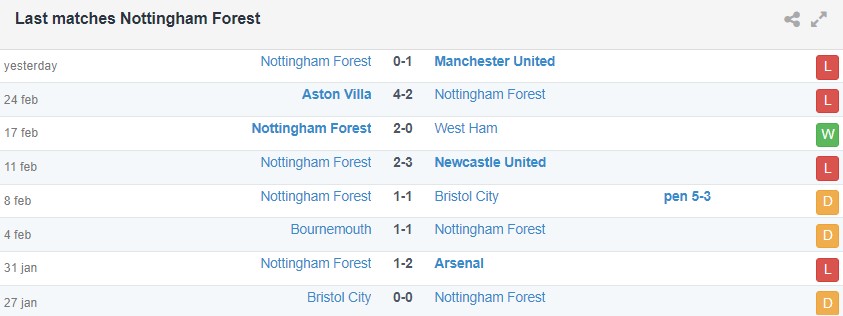 Phong độ gần đây của Nottingham Forest vs Liverpool