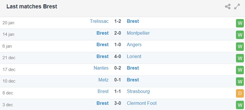 Ở phần sân đối diện, Brest đang là chú ngựa ô thú vị ở mùa giải năm nay khi đang bất bại 9 trận gần nhất trên mọi đấu trường, bao gồm 8 chiến thắng và chỉ 1 trận hòa. Họ cũng hiện chễm chệ ở vị trí thứ 3 trên BXH, kém PSG 6 điểm nhưng đá cùng số trận. Điều này đồng nghĩa, khoảng cách sẽ được rút xuống đáng kể nếu đội khách có 1 chiến thắng rời sân Công viên các hoàng tử.