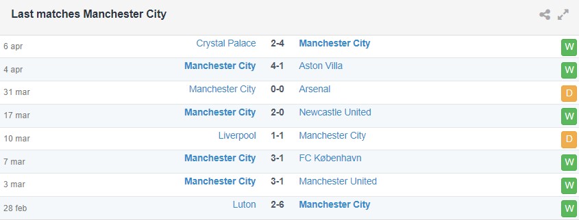 Ở phần sân đối diện, Man City cũng tỏ ra là một đối thủ xứng tầm với đại diện xứ đấu bò với thành tích bất bại 24 trận gần nhất, đồng thời cũng không thua trận nào trong 10 chuyến xa nhà vừa qua.