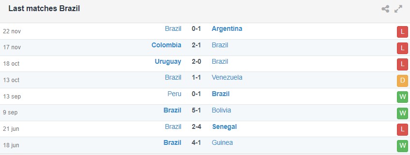 Về thành tích đối đầu, Brazil có đôi chút an ủi khi họ chỉ thua 4 lần trong 26 lần gần nhất 2 đội gặp nhau, nhưng trận giao hữu gần đây nhất giữa hai bên vào tháng 11 năm 2017 đã kết thúc với tỷ số hòa. trận hòa không bàn thắng buồn tẻ.