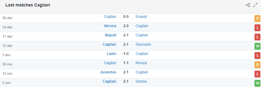 Ở phần sân đối diện, Cagliari đang rơi vào tình thế không mấy sáng sủa khi chỉ mới thắng 3/18 trận tại Serie A kể từ đầu mùa. Trong 7 trận gần nhất, Cagliari chỉ thắng có 1 và thua tới 4. Trên sân khách, Cagliari thể hiện cực kỳ kém thuyết phục khi chỉ thắng 1/10 trận gần nhất, trong đó có chuỗi thua 4 trận liên tiếp. Thành tích này khiến đoàn quân của HLV Claudio Ranieri hiện nằm trong nhóm cầm đèn đỏ với 14 điểm, cách nhóm an toàn chỉ 2 điểm nhưng cũng chỉ hơn vị trí cuối bảng 2 điểm. Vậy nên, nhiệm vụ của họ hiện tại có lẽ là tập trung cho đấu trường quốc nội hơn đấu trường Cup.