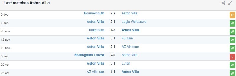 Tuy nhiên, không phải ngẫu nhiên mà Aston Villa hiện đứng thứ 4 trên BXH hiện tại. Họ đã bất bại 5/6 trận gần nhất, chỉ thua sốc mỗi Nottingham Forest, còn lại là 1 trận hòa với Bournemouth cùng 4 chiến thắng trước West Ham, Luton, Fulham và Tottenham. Ngoài ra, Aston Villa cũng sẽ tự tin hơn rất nhiều khi bước vào trận đấu này với chuỗi 13 trận bất bại 13 trận sân nhà gần nhất tại Premier League.