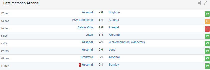 Ở phần sân đối diện, sau thất bại 0-1 trước Aston Villa, Arsenal đã nhanh chóng tìm lại niềm vui chiến thắng khi đánh bại Brighton 2-0 cuối tuần trước. Đây cũng là trận thắng thứ 12 của Pháo thủ tại EPL mùa này, ít hơn 3 trận so với cùng giai đoạn ở mùa giải trước. Tuy nhiên các học trò của HLV Arteta lại đang cho thấy sự cải thiện đáng kể về mặt bản lĩnh trong các trận cầu lớn khi quật ngã được Man City và giành 1 điểm trên sân Chelsea trong thế bị dẫn trước 2 bàn. Dù vậy, không thể không đề cập rằng 2 trận thua kể từ đầu mùa giải của Arsenal đều là những trận hành quân xa nhà.