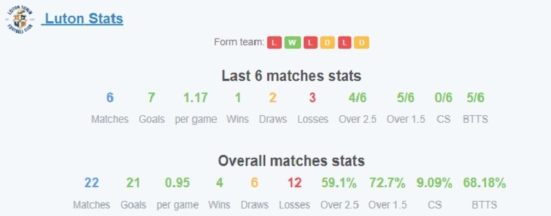 Thực tế, viễn cảnh này là khó tránh khỏi, bởi trong 8 vòng gần nhất, Luton Town chỉ thắng 1 nhưng thua tới 5 trận. Mới nhất là thất bại 1-3 trên sân khách trước Brentford và đây đã trận thua thứ 9 của đội bóng này kể từ đầu mùa giải. Dù vậy, khả năng để Luton giành ít nhất 1 điểm vẫn là có, bởi họ sở hữu lợi thế sân nhà, nơi họ giành được 5/9 điểm sau 6 trận đã qua tại thánh địa của mình. Đồng thời, Luton đã ghi bàn ở 5/6 trận sân nhà mùa này. Ngoài ra, họ cũng chưa để thủng lưới nhiều hơn hai bàn trong bất kỳ trận đấu nào ở Premier League tại Kenilworth Road.