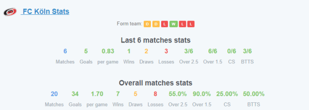 Điều này đến từ việc Cologne đang có hàng công tệ nhất giải đấu với chỉ 9 bàn thắng ghi được. Chưa bao giờ trong lịch sử Bundesliga có một đội có thành thích làm bàn yếu kém như thế này sau 11 trận đầu tiên của mùa giải. Tuy nhiên cũng cần lưu ý, Die Geißböcke đang có tín hiệu lạc quan nhất định khi bất bại 3/4 trận đấu mới đây ở giải quốc nội. Đội bóng này cũng vừa mới có chiến thắng tưng bừng 8-0 trước Porz dù chỉ là trận đấu giao hữu.