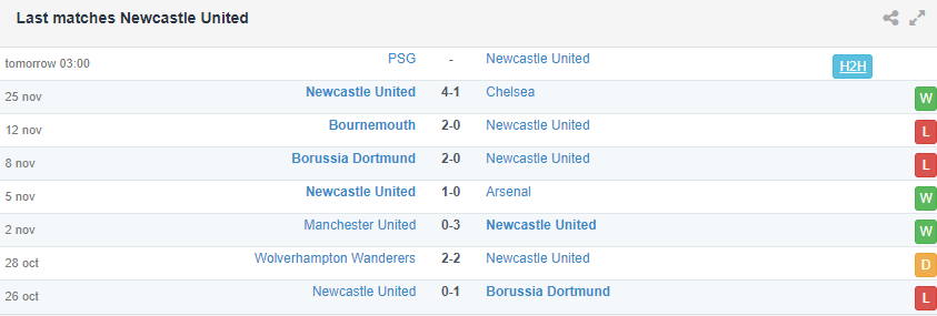 Ở phần sân đối diện, Newcastle có khởi đầu tuyệt vời trong lần đầu trở lại Champions League sau 20 năm khi cầm hòa Milan và đánh bại PSG 4-1 trên sân nhà. Tuy nhiên, đội bóng này nhanh chóng trở lại mặt đất với 2 thất bại liên tiếp trước Borussia Dortmund và hiện đang đứng cuối bảng F hiện tại. Nói một cách đơn giản, ‘Những chú chim chích chòe’ buộc phải giành chiến thắng ở trận đấu này, còn không thì 90% họ sẽ bị loại. Áp lực là thế, nhưng hiệu ứng từ chiến thắng 4-1 trước Chelsea cuối tuần qua ở EPL có thể trờ thành động lực cho Newcaslte trong chuyến đi tới thủ đô nước Pháp. Thực tế, Newcastle chỉ thua 3 trong số 15 trận gần đây nhất trên mọi đấu trường (9 thắng, 3 hòa).