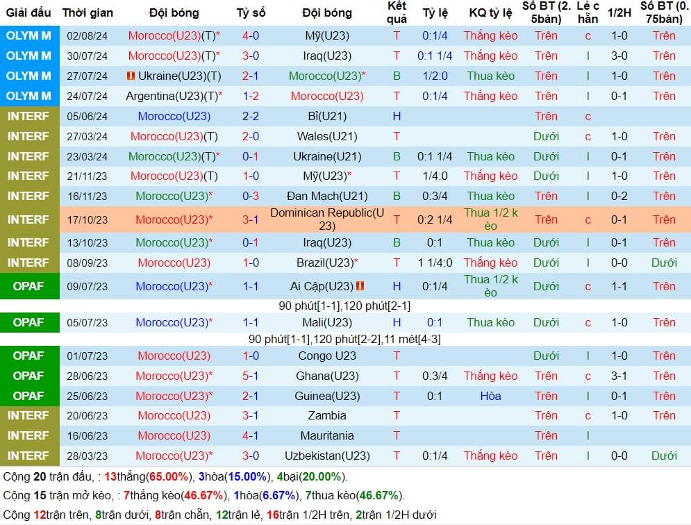 Phong độ gần đây của U23 Morocco vs U23 Tây Ban Nha
