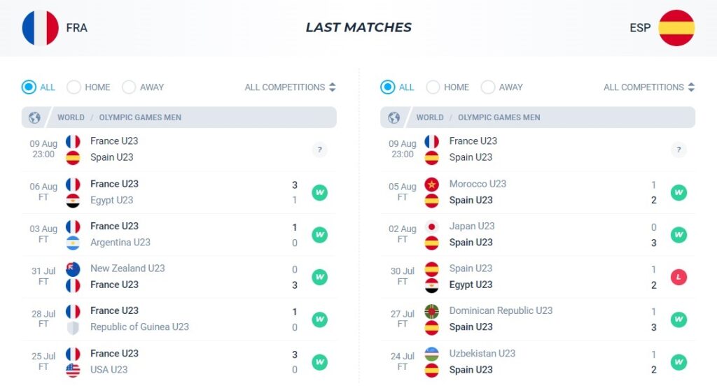 Phong độ gần đây của U23 Tây Ban Nha vs U23 Pháp