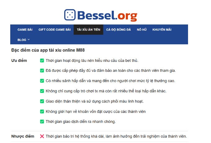 - Thông tin đánh giá của Bessel rất chi tiết, bao gồm các phân tích về lợi ích, khuyến mãi, giao diện, tính năng và kinh nghiệm sử dụng. Lưu ý, bạn vẫn cần xem xét và xác minh các thông tin được cung cấp trước khi quyết định đặt cược hay không.