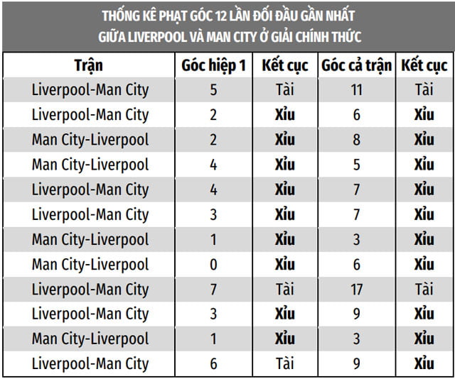 Man City chấp nửa trái. Trong 8 trận chính thức gần đây khi Man City chấp tối đa 3/4 trái, 6 trận đã về xỉu phạt góc. Về khía cạnh đối đầu, trong 12 lần chạm trán gần nhất giữa đôi bên tại các giải đấu chính thức, 10 trận đã về xỉu góc (trong đó rất nhiều lần xảy ra ở hoàn cảnh cả 2 đội đều đang cày góc cực khỏe). 9/12 trận nói trên về xỉu góc hiệp 1.