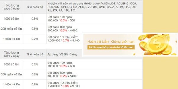 Chính sách hoàn trả là chuyên mục không thể thiếu trên hệ thống của nhà cái 789bet nhằm hỗ trợ người chơi khi thua cuộc trong các ván cược. Tỷ lệ hoàn tiền thua cược của nhà cái được đánh giá là rất cao so với nhiều thương hiệu giải trí trực tuyến khác. Theo đó, người chơi chỉ cần đạt được tổng tiền cược hợp lệ trong vòng 7 ngày từ 1000 điểm trở lên là đã có cơ hội được hoàn tới 0.5%.