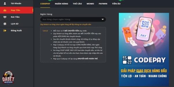 Trang chủ Dabet cung cấp cho khách hàng nhiều giải pháp nạp tiền thông minh. Bạn cần đảm bảo nạp đủ “đạn” để thoải mái đặt cược săn thưởng cùng nhà cái: