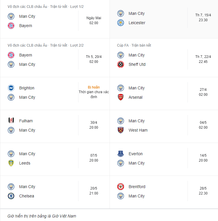 - Lịch thi đấu của Man City trong chặng đường còn lại của mùa giải