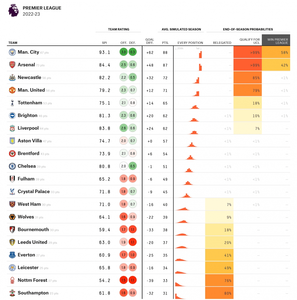 Theo thông tin từ chuyên trang Bóng đá số fun thì vòng đấu thứ 30 cuối tuần vừa qua, dù Arsenal sớm dẫn trước 2-0 Liverpool trong trận cầu muộn nhất vòng 30 Ngoại hạng Anh 2022/2023, nhưng Pháo thủ vẫn bị Lữ đoàn đỏ cưa điểm với tỉ số 2-2. Với kết quả này, cộng thêm việc Manchester City giành thắng lợi 4-1 trước Southampton ngày thứ 7 thì hiện tại Arsenal vẫn đang giữ ngôi đầu Ngoại Hạng Anh với 73 điểm, sau 30 trận đấu, Man City xếp thứ 2 với 67 điểm sau 29 trận đã đấu (đá ít hơn Arsenal 1 trận).