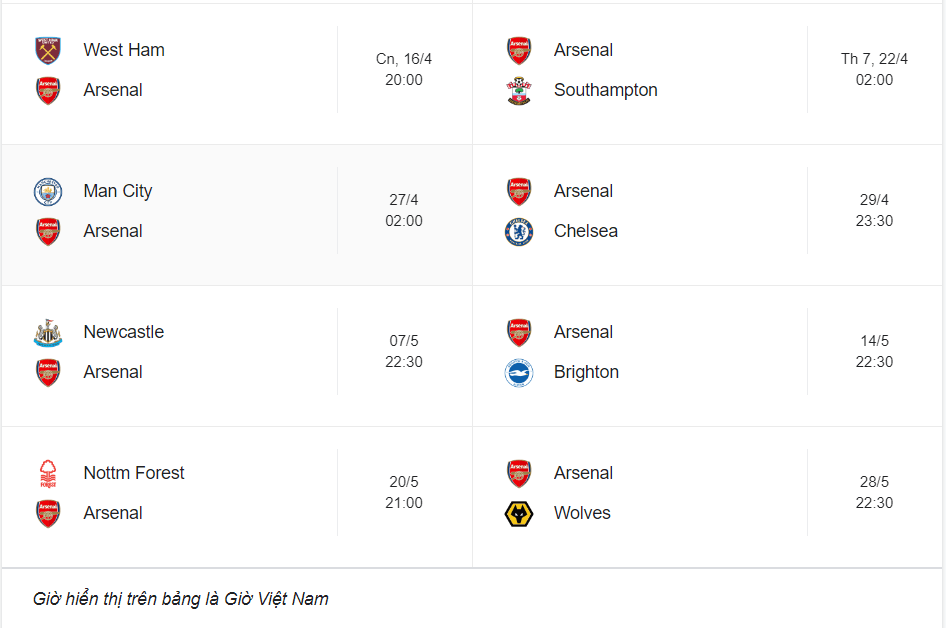 - Lịch thi đấu trong chặng đường còn lại của Arsenal tại EPL